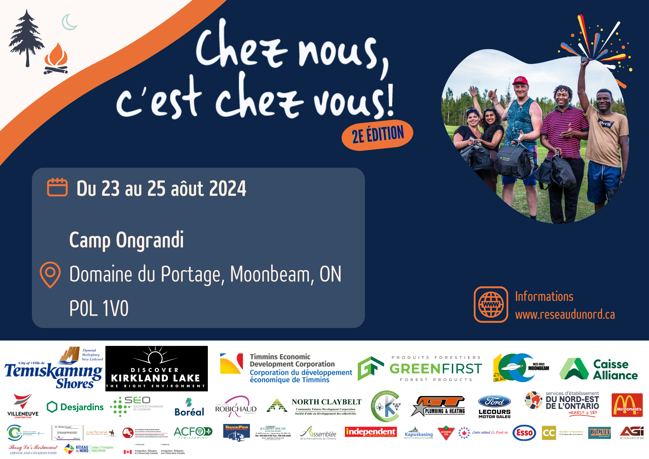 L’événement se tiendra cette année à Moonbeam (Camp Ograndi), dans le Nord-Est de l’Ontario, du 23 au 25 août 2024. Pendant trois jours, les participants auront l’occasion de découvrir les joies du camping et de la vie en chalet, tout en s’immergeant dans la culture locale. Des activités variées seront proposées, allant de la randonnée au feu de camp, en passant par des ateliers de survie en plein air et des jeux en plein air.